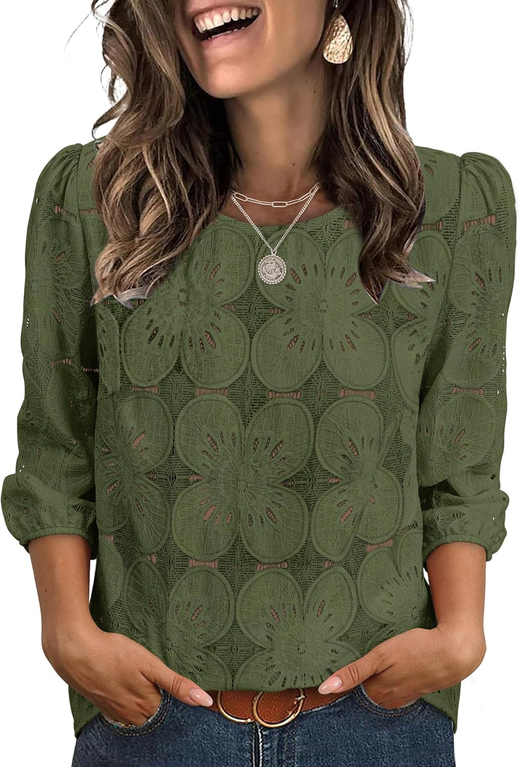 Sampeel 3/4 Sleeve Tops for Women Dressy Casual Lace Eyelet Blouse Spring Summer